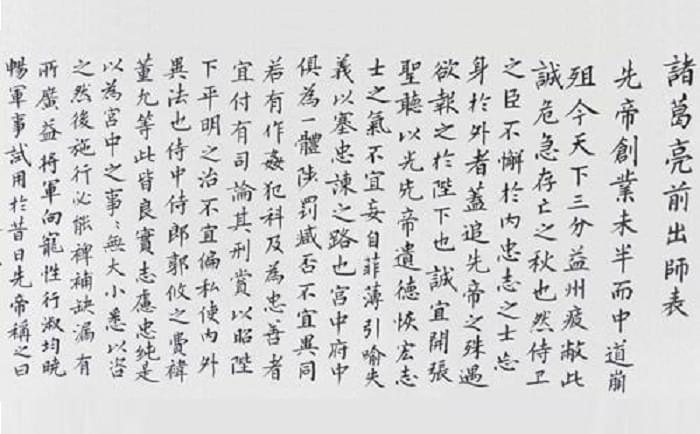 前出师表俗称出师表,出自于《三国志·诸葛亮传》卷三十五,是三国时期(227年)蜀汉丞相诸葛亮在决定北上伐魏、夺取长安(今汉长安城遗址)之前给后主刘禅上书的表文。